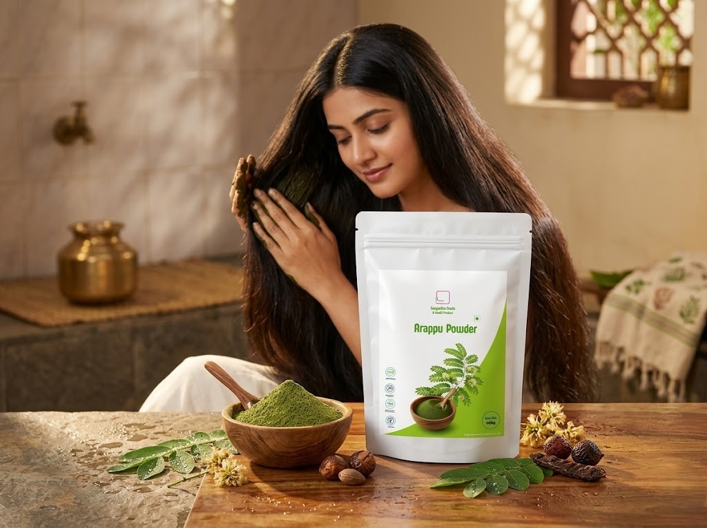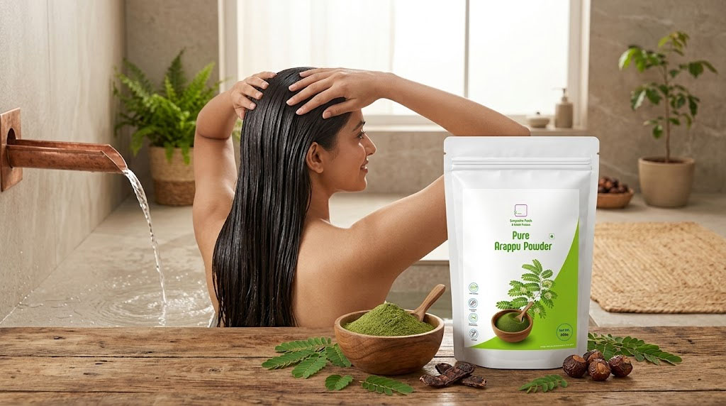 Unlike harsh soaps, Arappu acts as a mild conditioner that adds a natural shine and velvet-like softness to every strand.