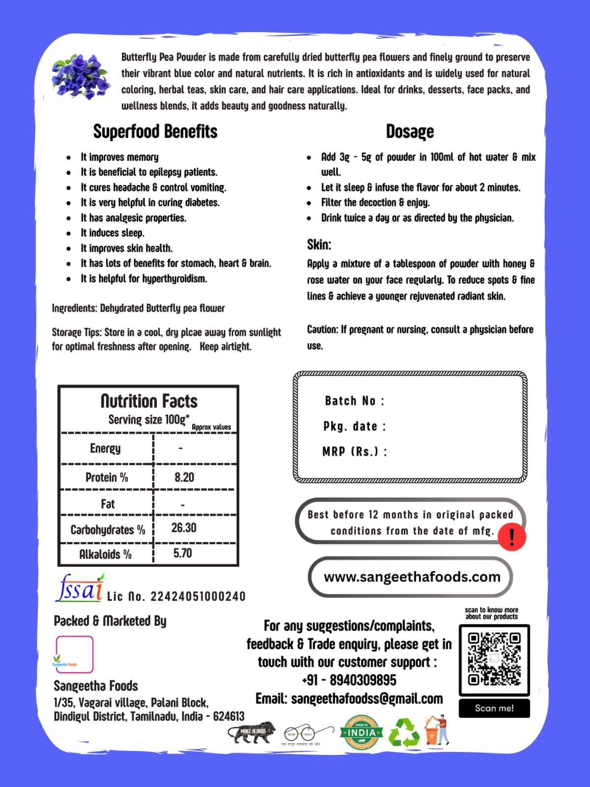 | Certification | FSSAI Licensed (No. 22424051000240) |