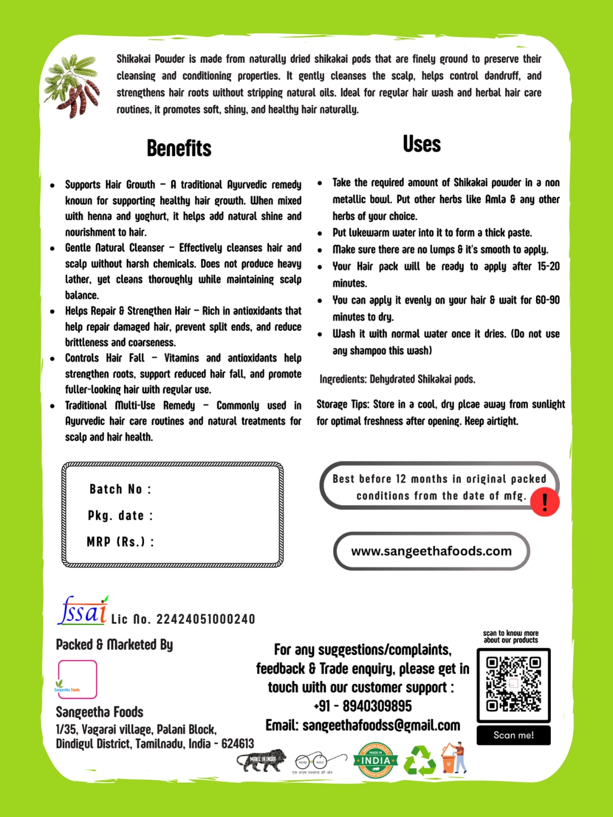 Very useful combo for natural hair care. I like that hibiscus, arappu, and seyakkai powders are all included together. It saves time because I don’t have to buy them separately. The powders look fresh and mix well when making a hair pack.