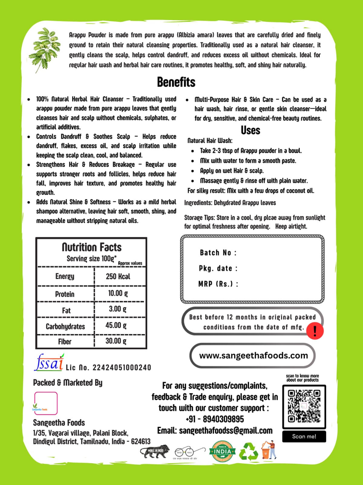 Derived from the leaves of the Albizia amara tree, Arappu is the traditional secret for achieving silky, manageable hair.