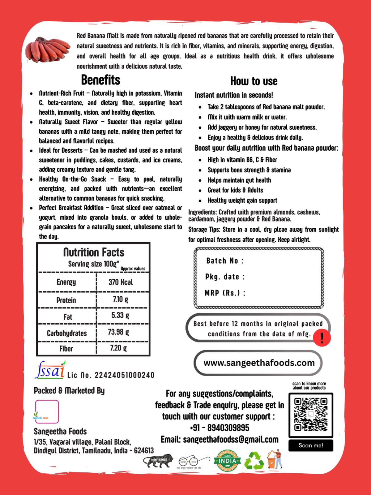 Experience the rich, creamy goodness of Sangeetha Foods Red Banana Malt. Made from naturally ripened red bananas, this premium malt is a powerhouse of nutrients, offering a sweeter and more flavorful alternative to regular yellow bananas. Carefully processed to retain every bit of its natural sweetness and nutritional value, our Red Banana Malt is the perfect wholesome drink for the entire family.