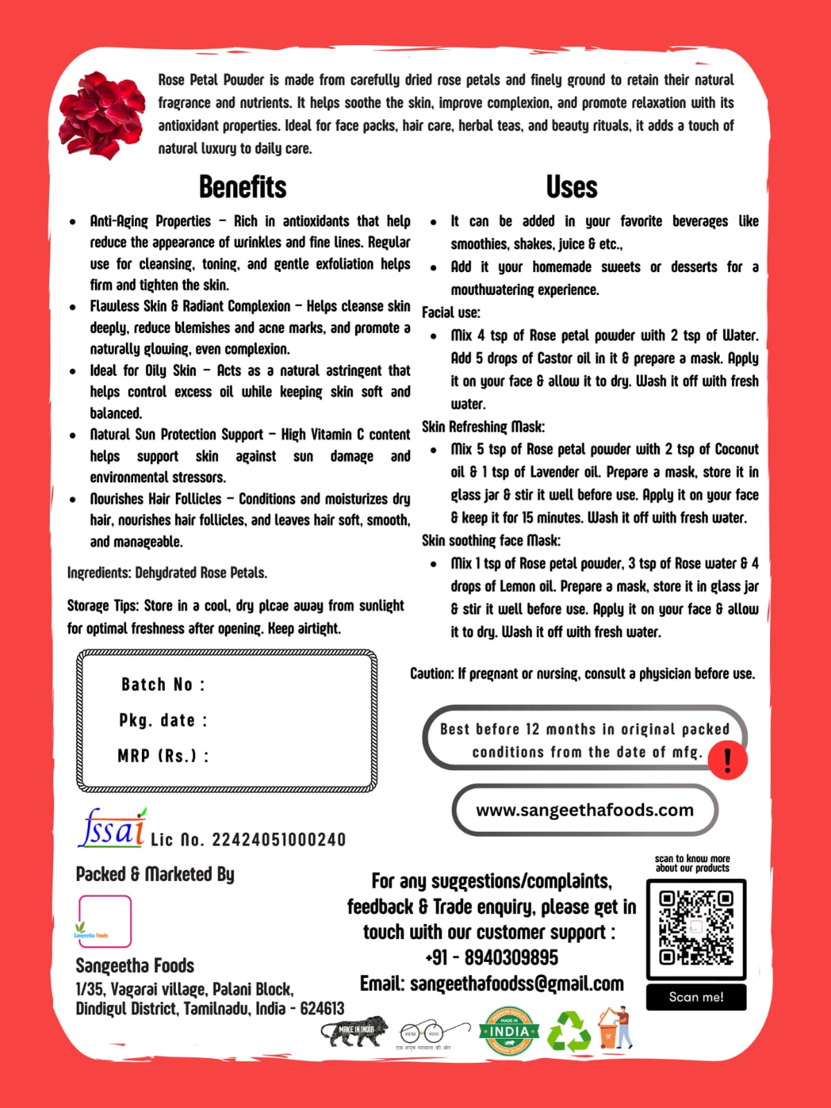 Indulge in the timeless elegance of Sangeetha Foods Pure Rose Petal Powder. Crafted from carefully dried, premium rose petals and finely ground to retain their exquisite fragrance and potent nutrients, this powder is a versatile beauty and wellness essential. Whether you are seeking a radiant glow, a soothing skin treatment, or a floral touch to your culinary creations, our 100% natural powder brings the luxury of roses directly to your daily ritual.
